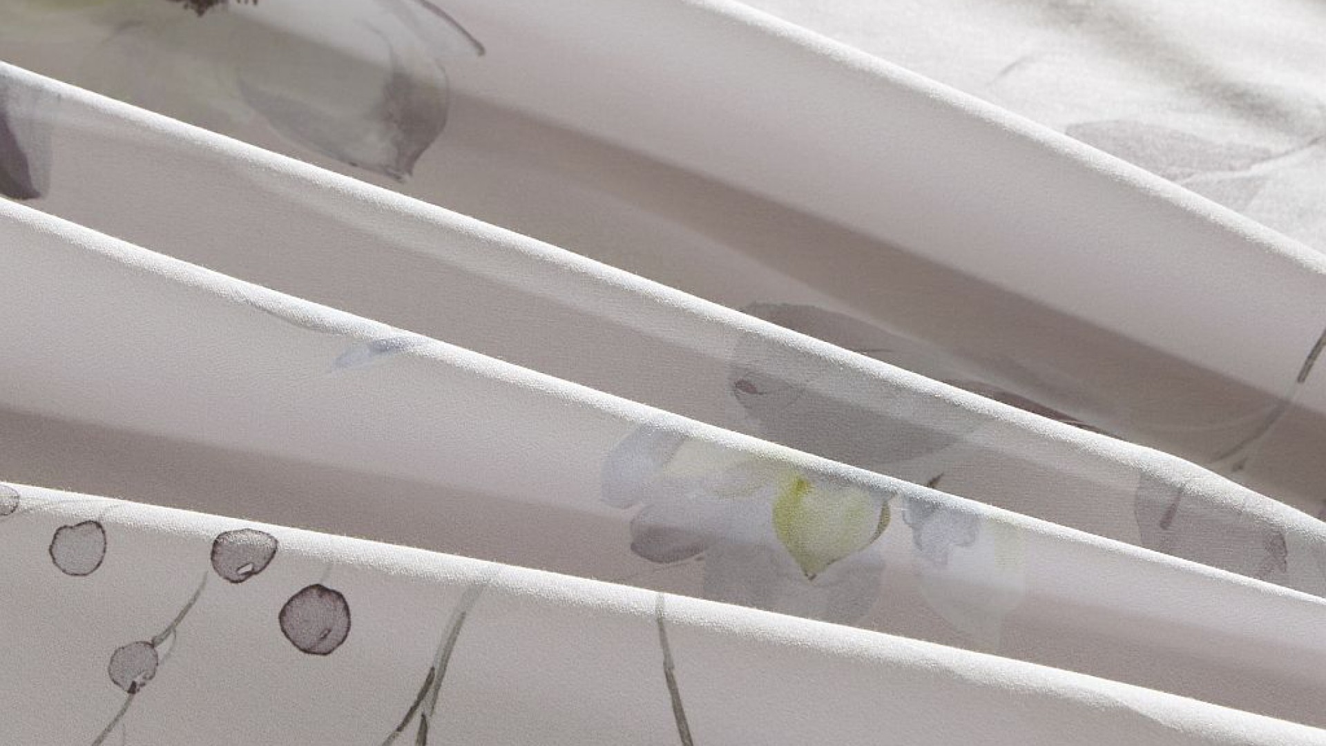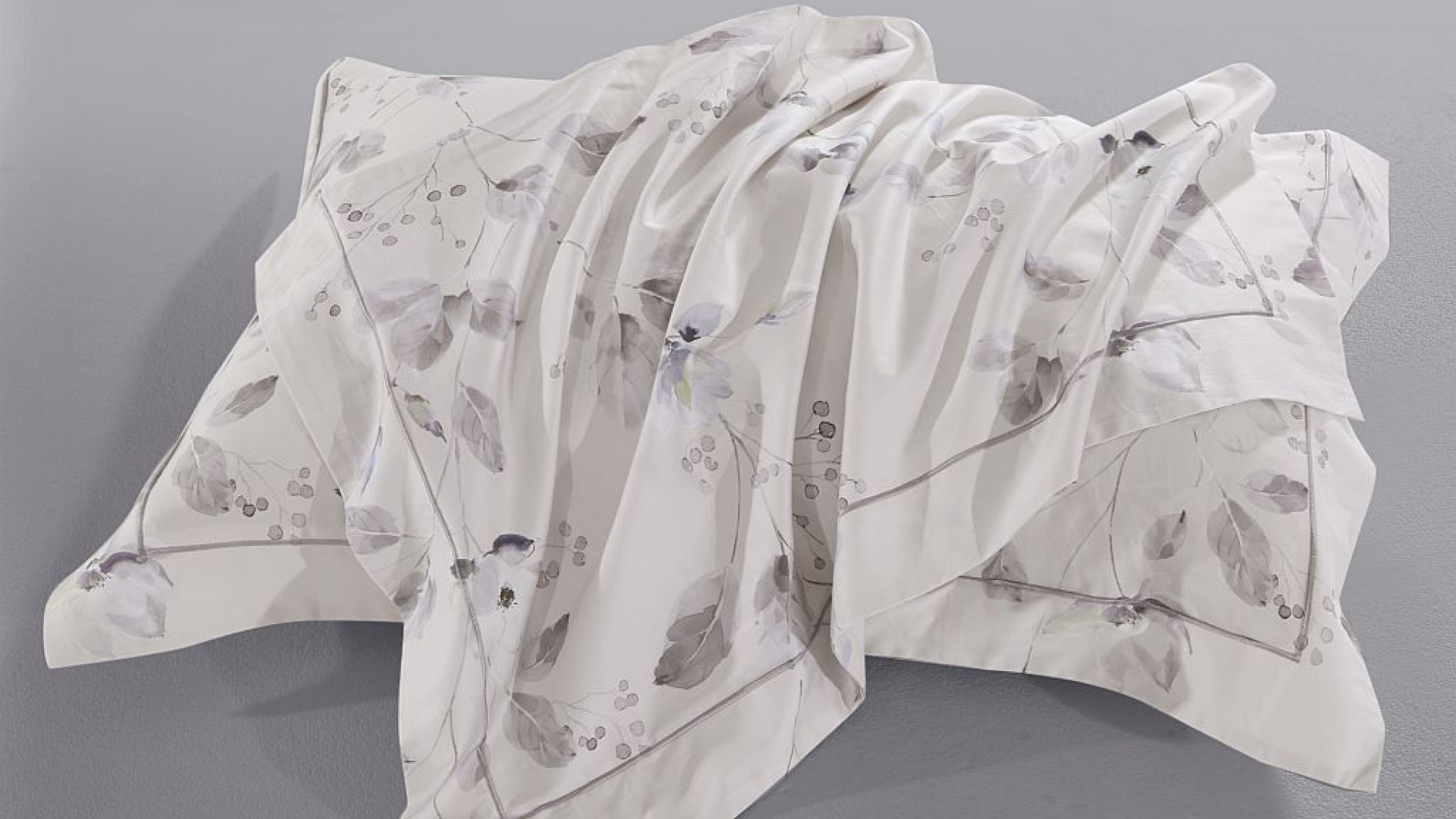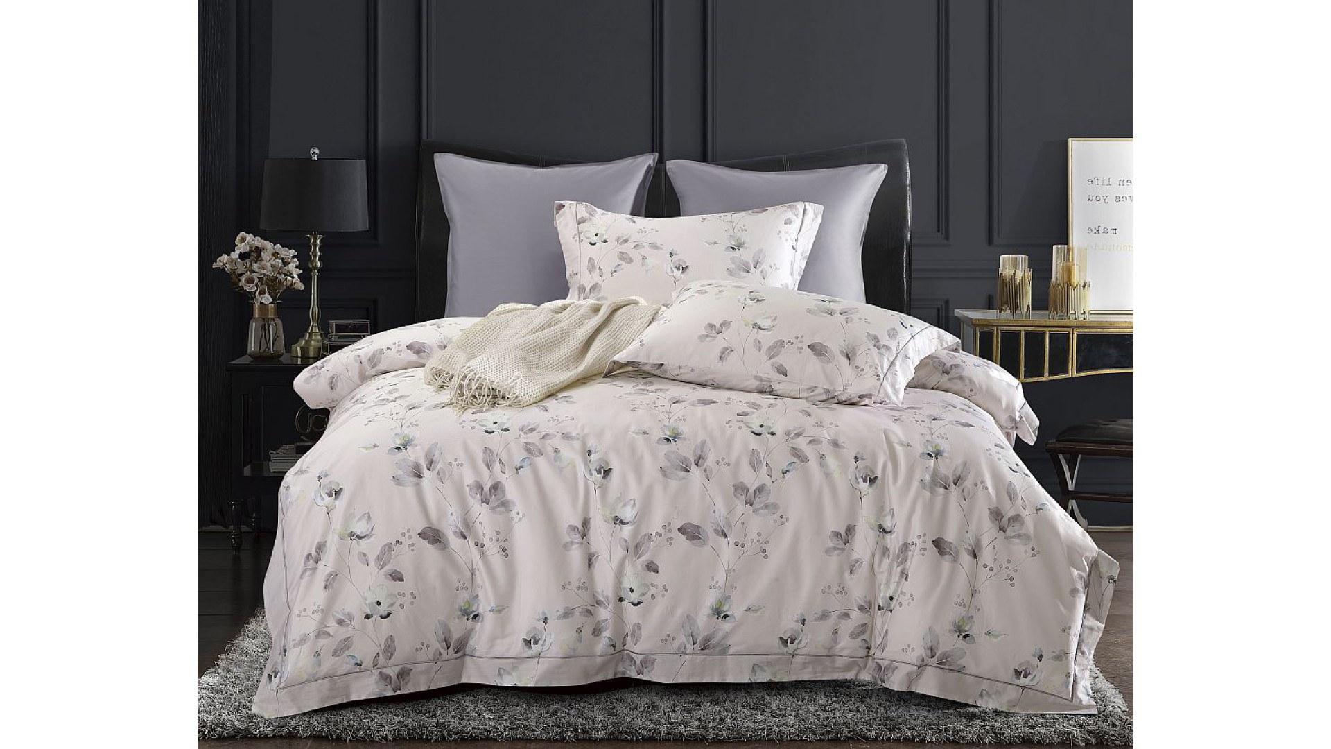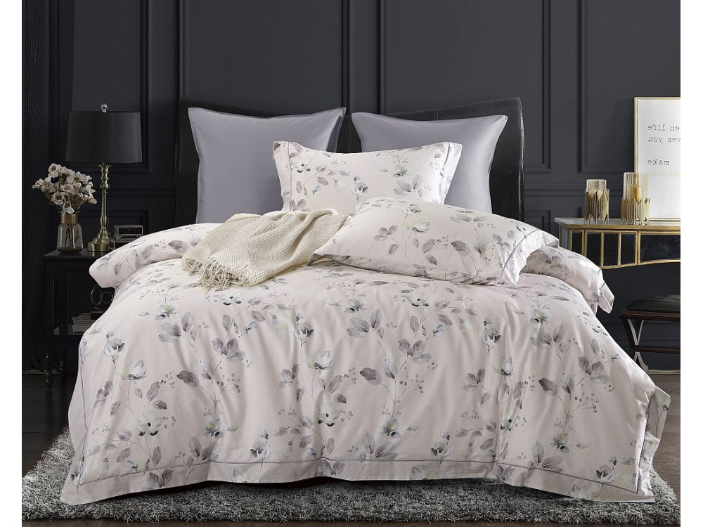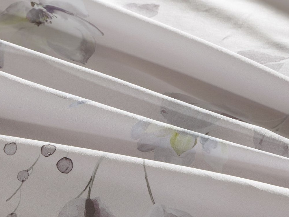 Очень органичное сочетание пастельных оттенков сиренево-розовой гаммы, акварельно выписанных веточек и пудрового тона комплекта дополненнены простыней цвета черничного йогурта.