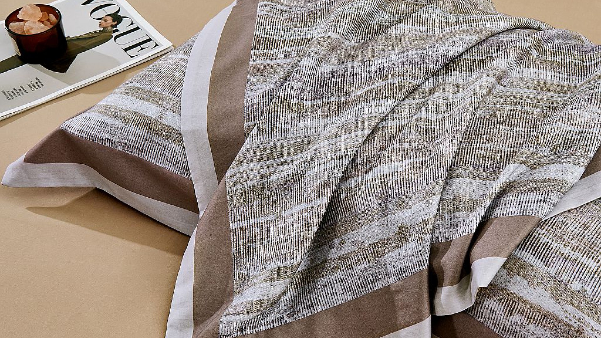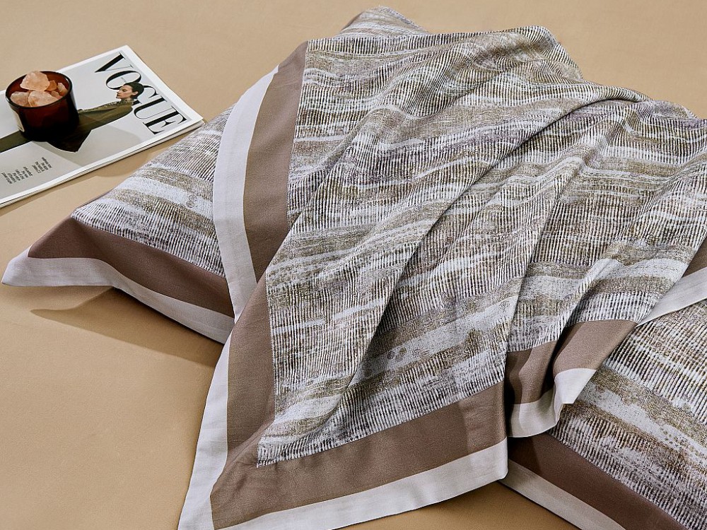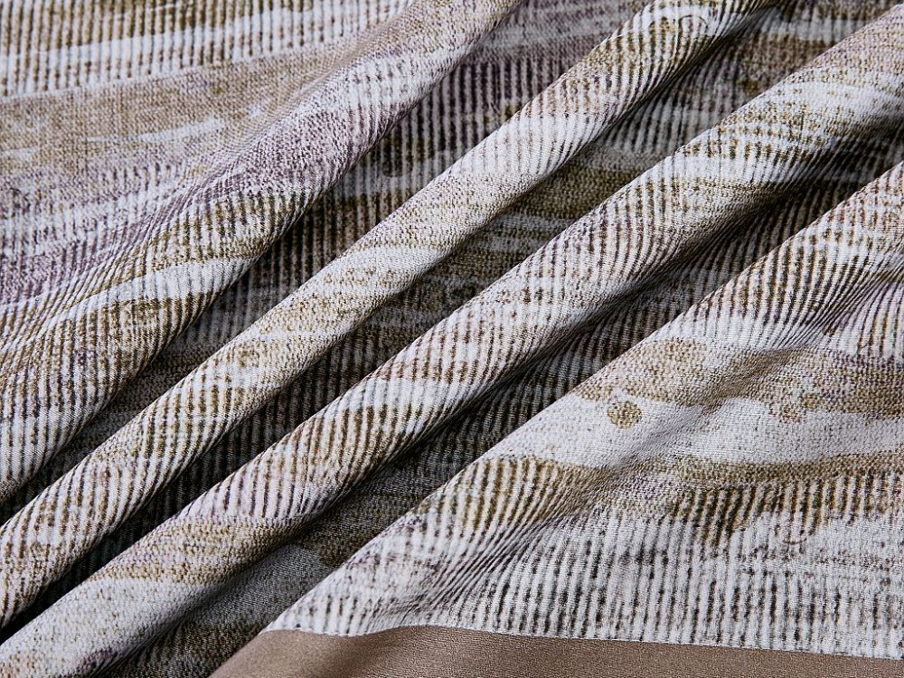В данном дизайне можно нафантазировать себе и слэбы суара, дуба или тополя. Для кого-то это просто графика или абстракция в коричневых тонах. А кто-то увидит срез полудрагоценного агата или сердолика. В любом случае Ваша фантазия будет обрамлена напечатанным двуцветным кантом серого и фундучного цветов. Ткань-компаньон в цвете соленой карамели.
