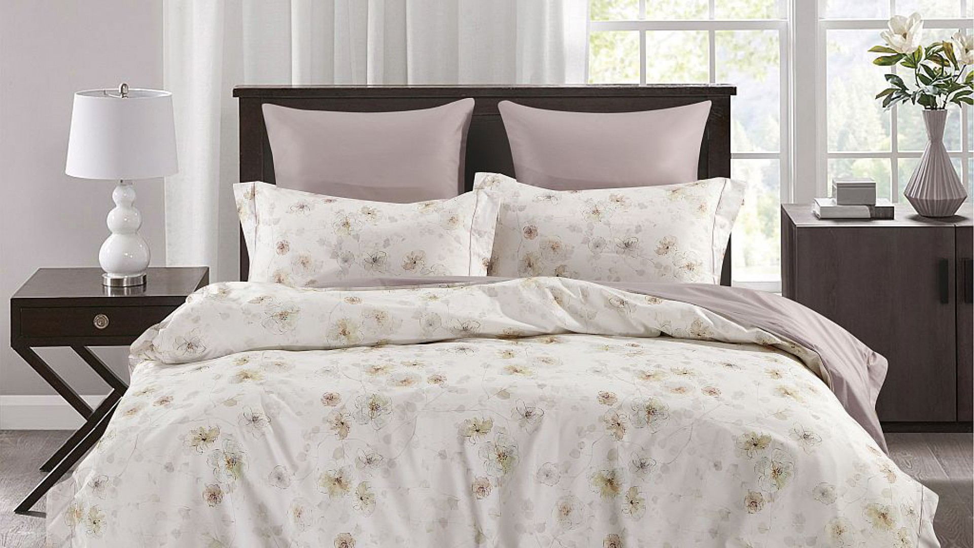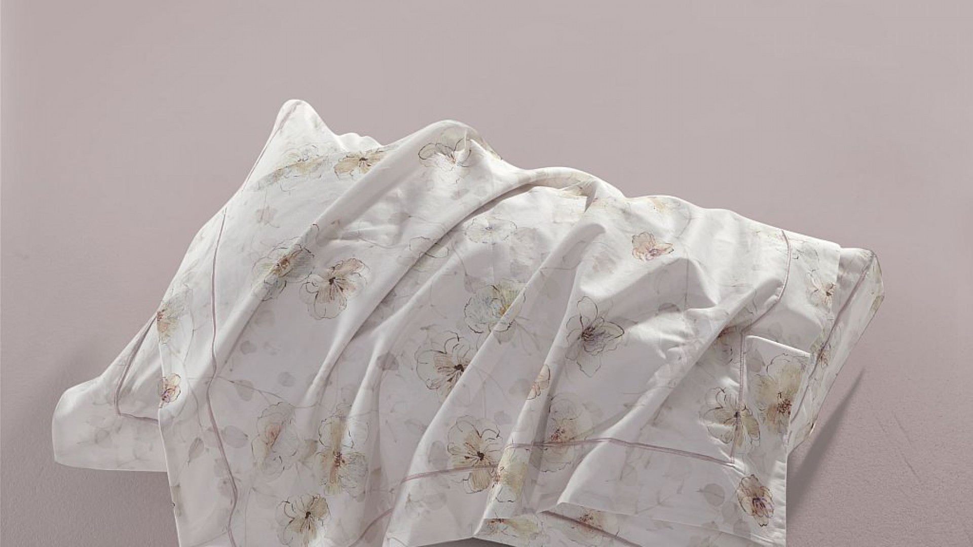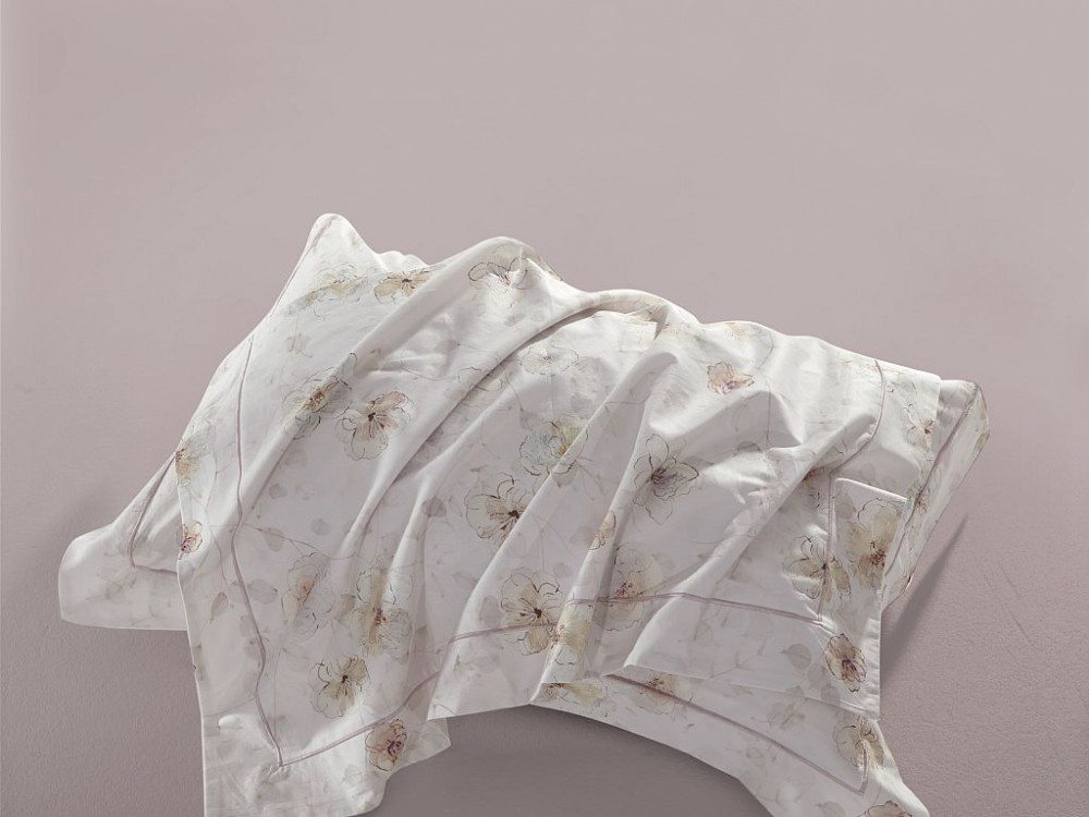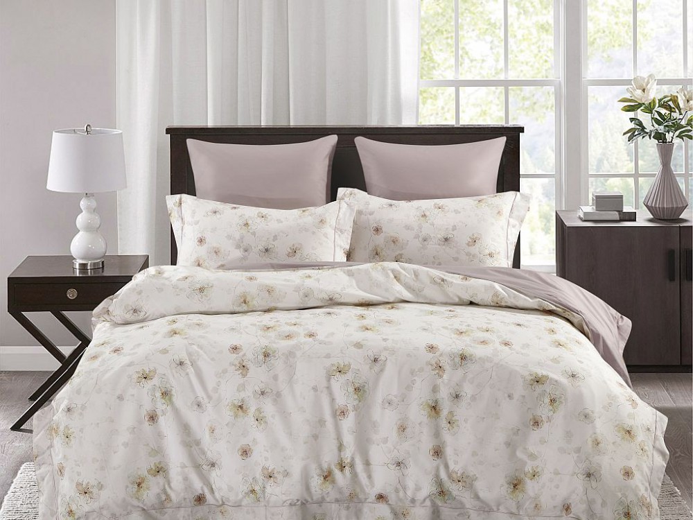 Нейтральный базовый комплект в спокойных оттенках с ненавязчивыми цветочными мотивами в молочно-бежевой гамме. Простынь в цвете розового жемчуга.