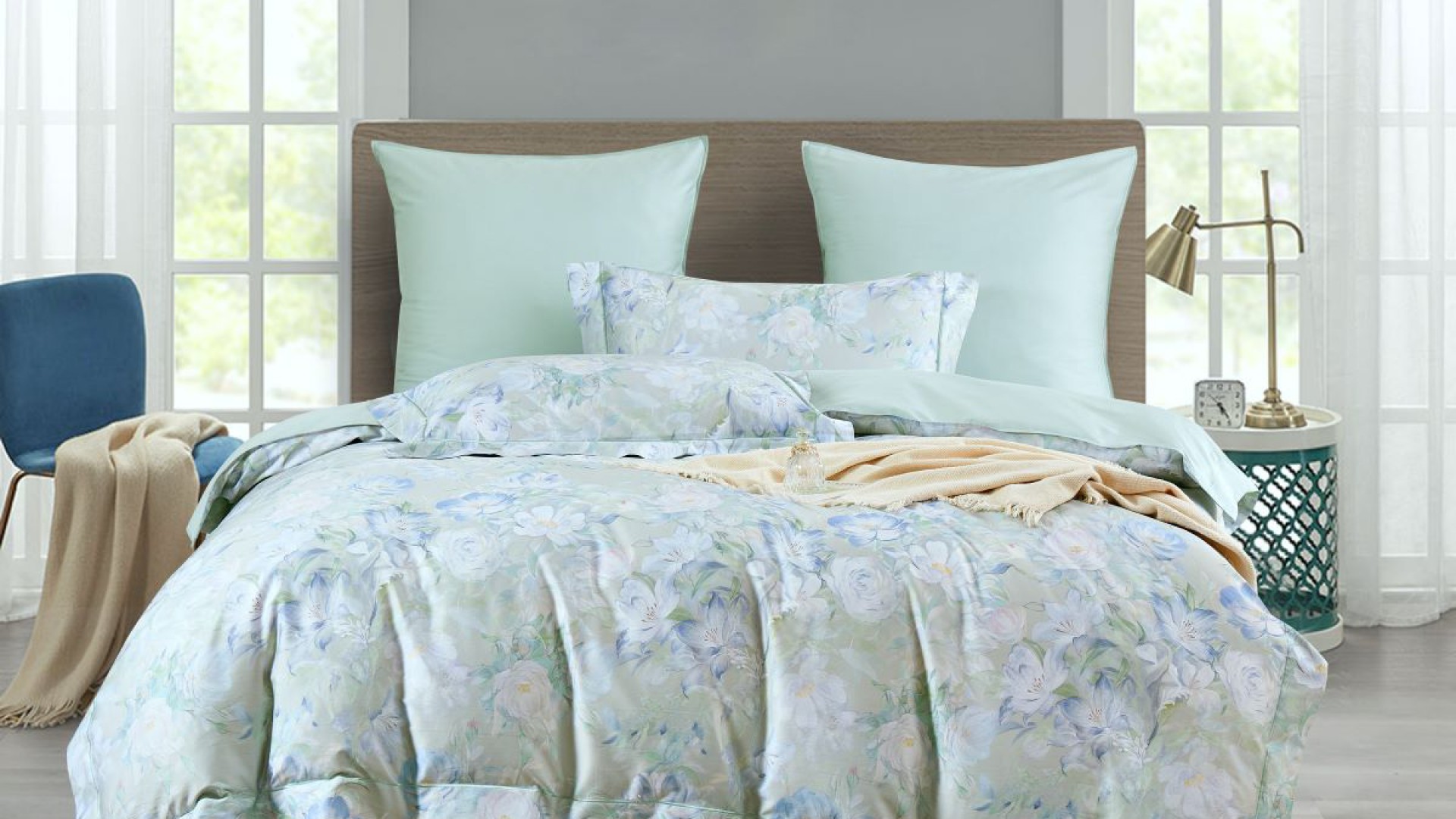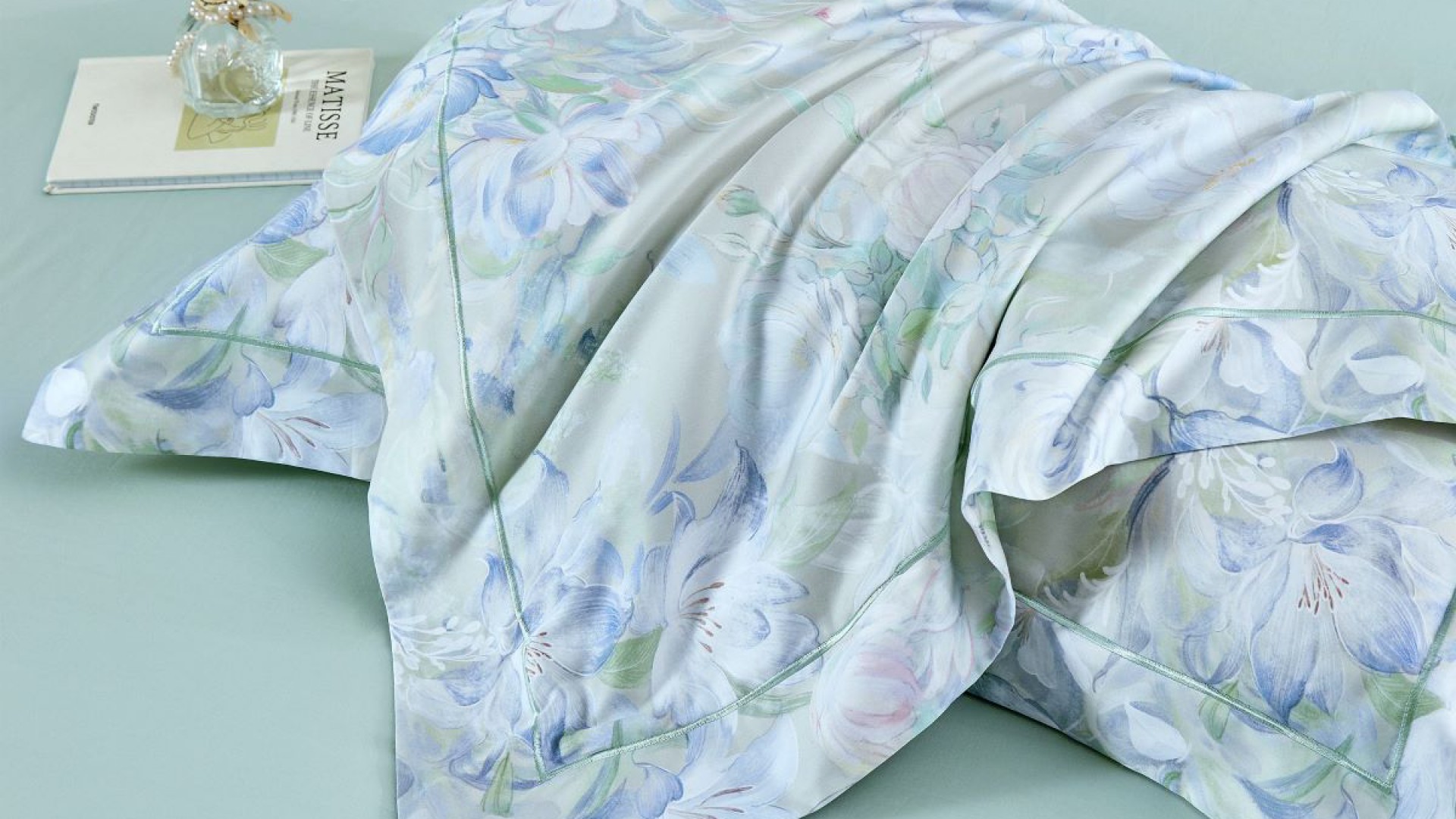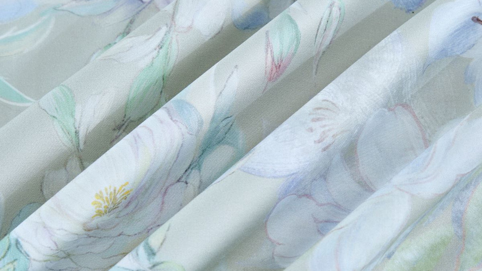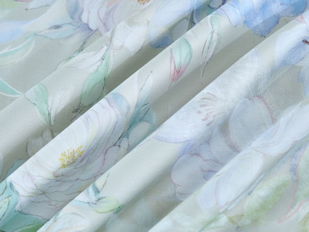 Дарящая прохладу молочно-мятная палитра разбавлена нежнейшими акварельными переходами голубых лилейников и розово-лавандовых пузатых пионов во всей красе. Ткань-компаньон в тон цвета фона.
