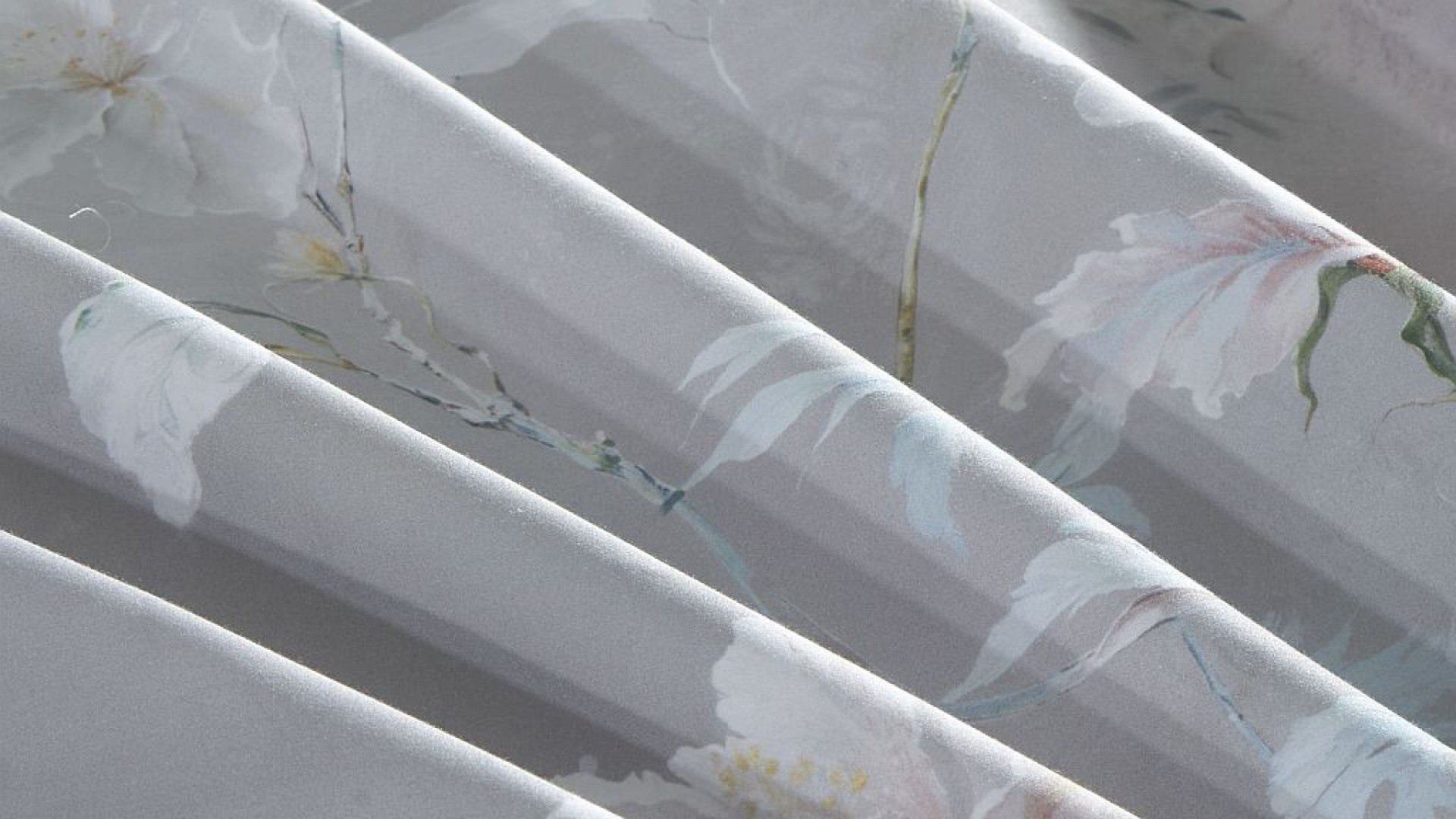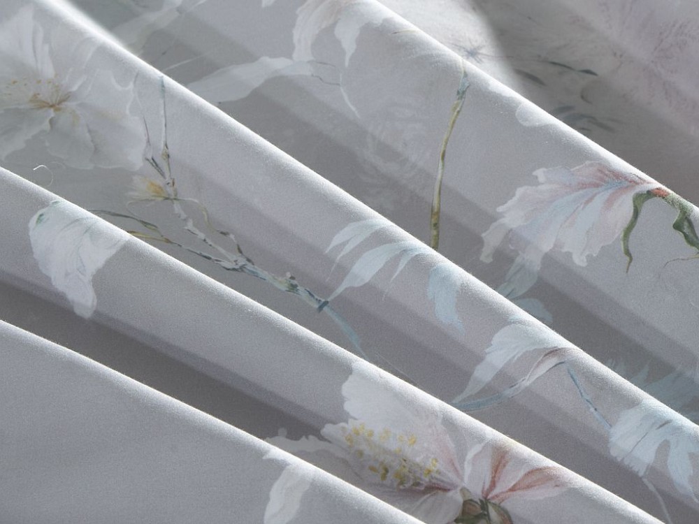 На светло-сером фоне размашистые букеты из акварельных астр, лилий, эвкалипта и анемонов.Ткань-компаньон в цвете топленого молока.