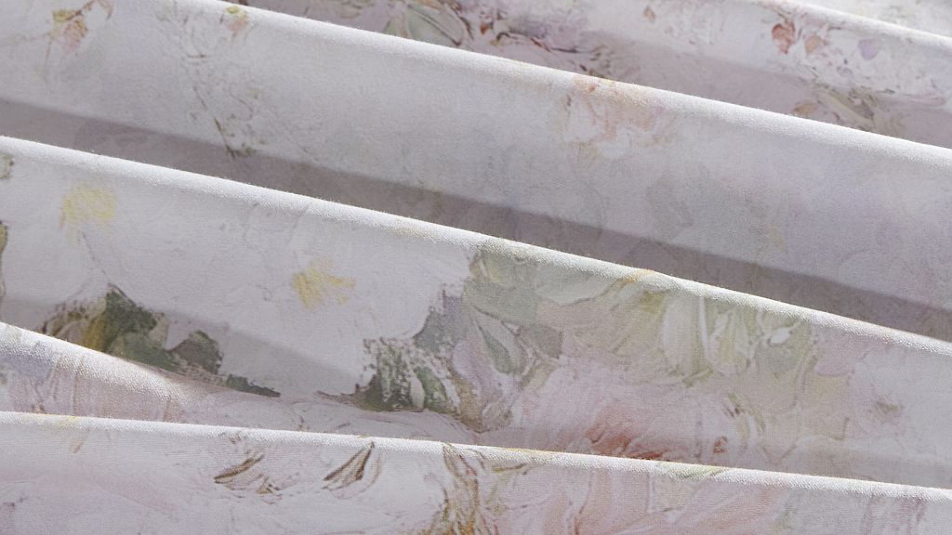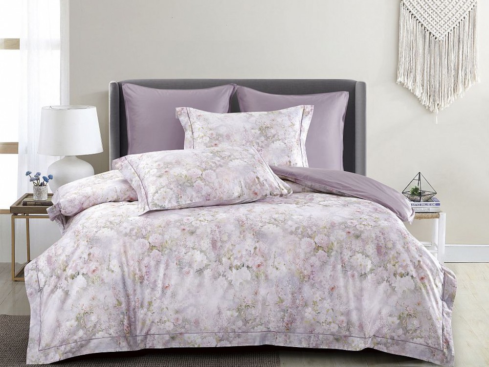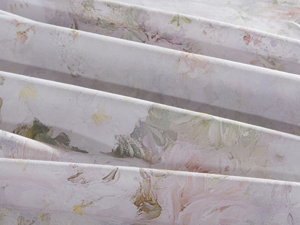 Сквозь розовую рассветную дымку проглядываеют кустовые розы, пионы, сирень, лаванда и анемоны, дополненные однотонной простыней розово-сиреневого цвета.