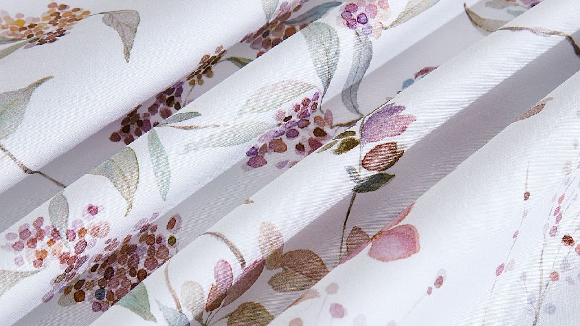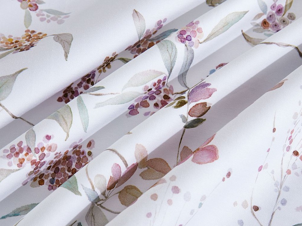 Яркие блики акварельных цветов и кустарников на белоснежном фоне. Ткань-компаньон в цвете малинового щербета.