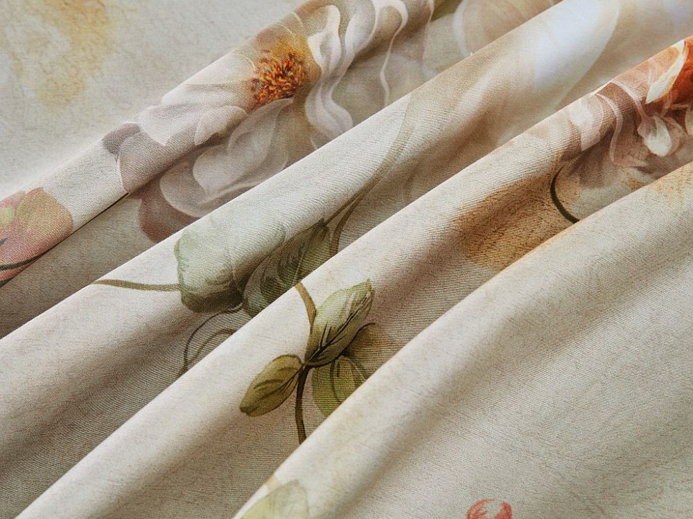 Пышные бутоны роз словно перерисованы с натюрмортов голландских мастеров 19 века. Ренессанс во всей своей красоте: объем, детализации и ощущение застывшей жизни на полотнах. Ткань-компаньон оливкового цвета.