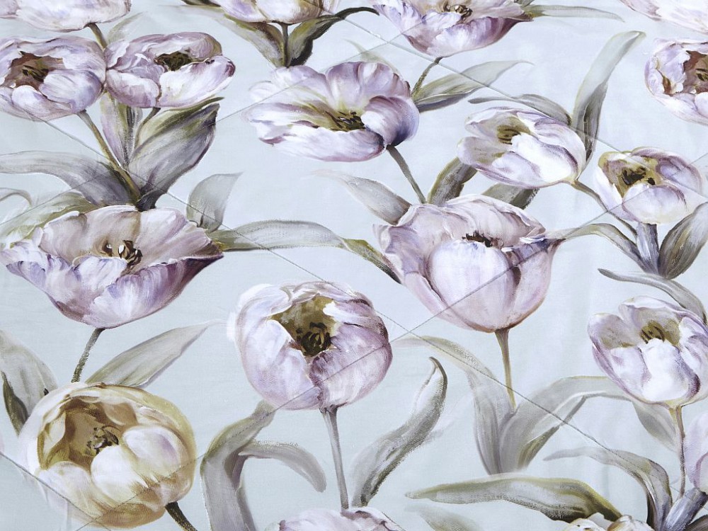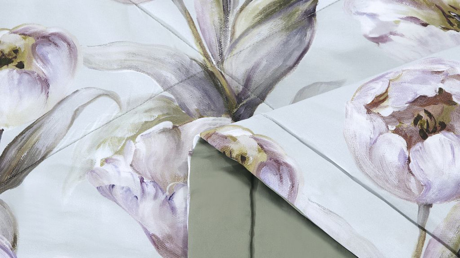 Сочные тюльпаны во всем великолепии, словно сразу ощущаешь их травянистый запах и хруст молодых стеблей, которые, как предвестники весны, настраивают на позитивный лад. Вторит этому настроению и простынь в цвете сочного зеленого яблока.