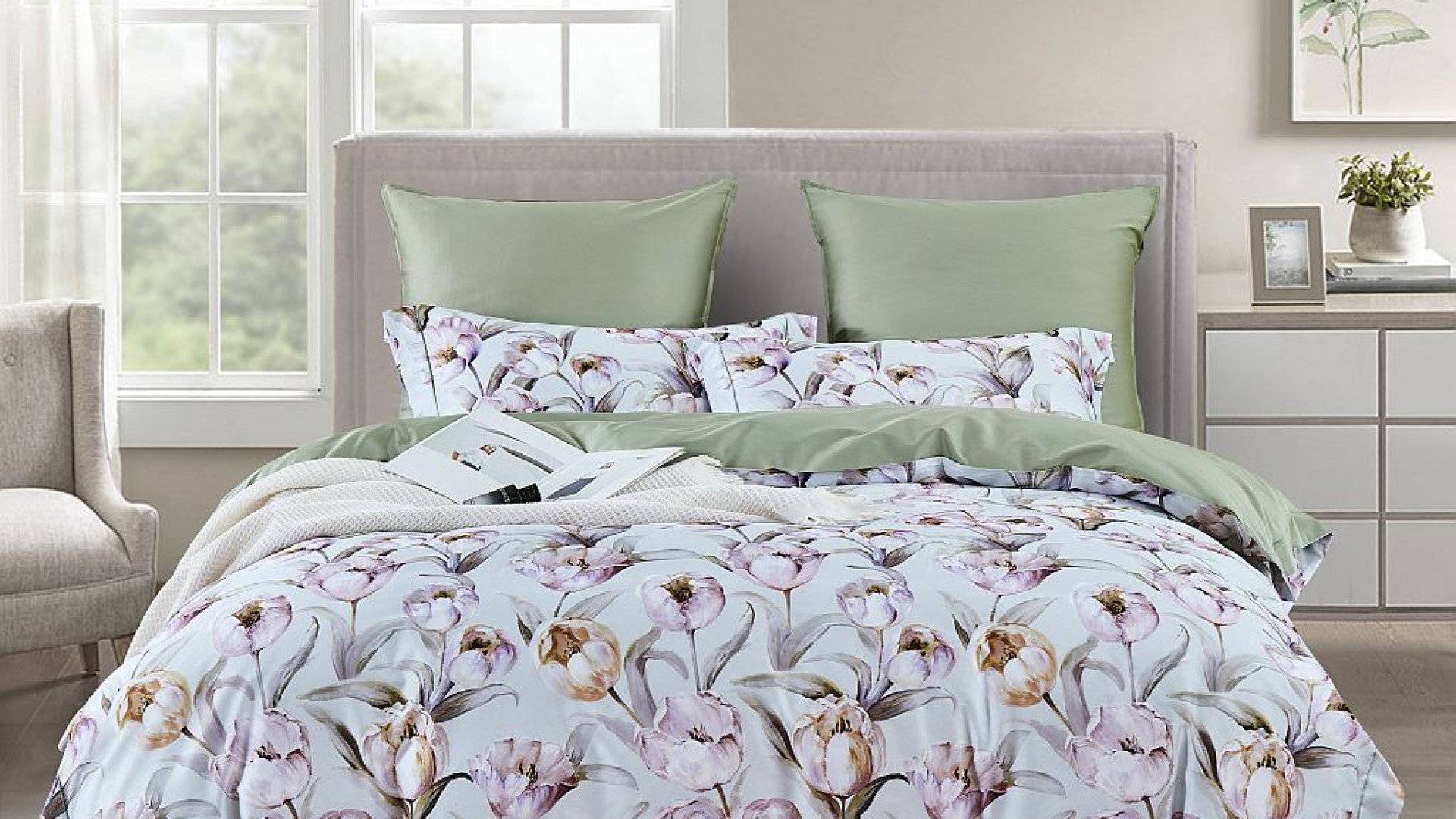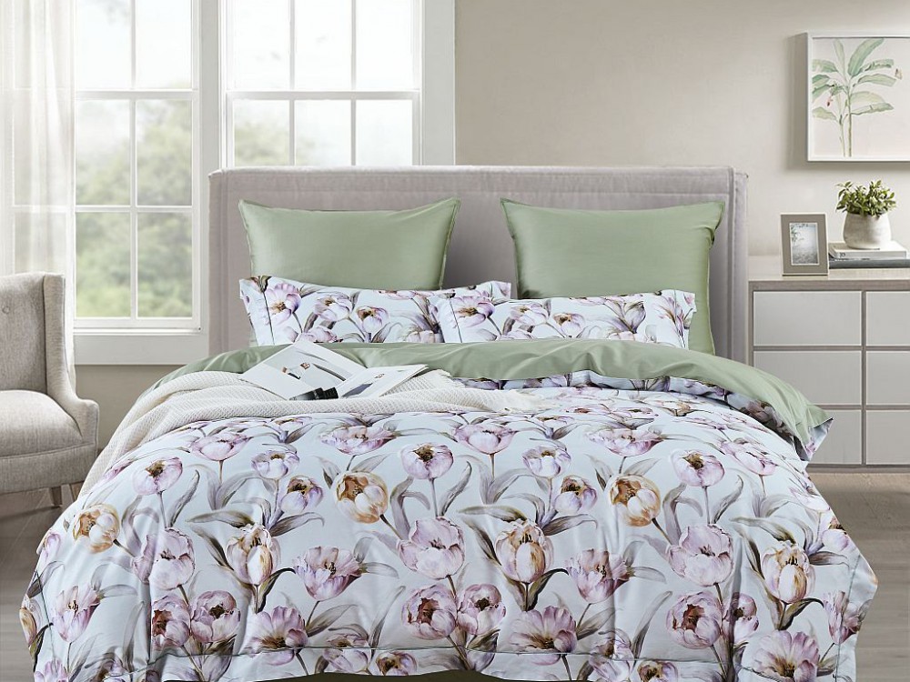 Сочные тюльпаны во всем великолепии, словно сразу ощущаешь их травянистый запах и хруст молодых стеблей, которые, как предвестники весны, настраивают на позитивный лад. Вторит этому настроению и простынь в цвете сочного зеленого яблока.
