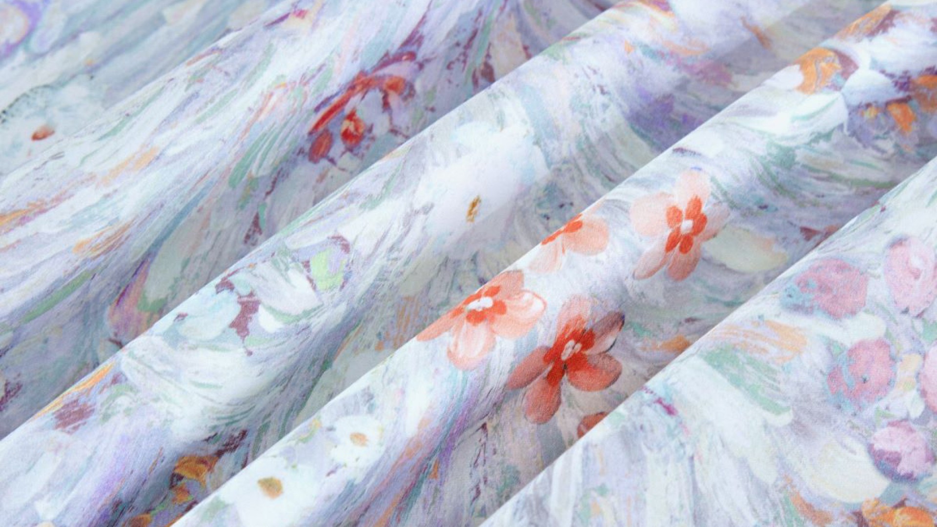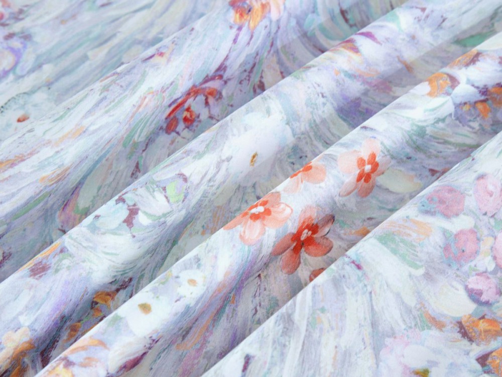 Мелкий цветочный мотив в лавандовой палитре Поля Синьяка с яркими всполохами красно-оранжевых зонтиков лихнисов. Однотонная ткань-компаньон в цвете лавандового рафа)