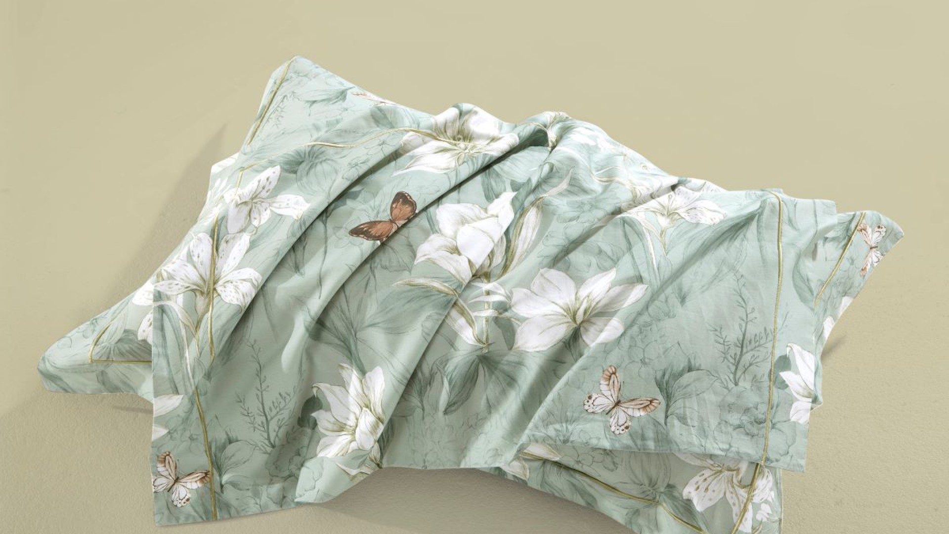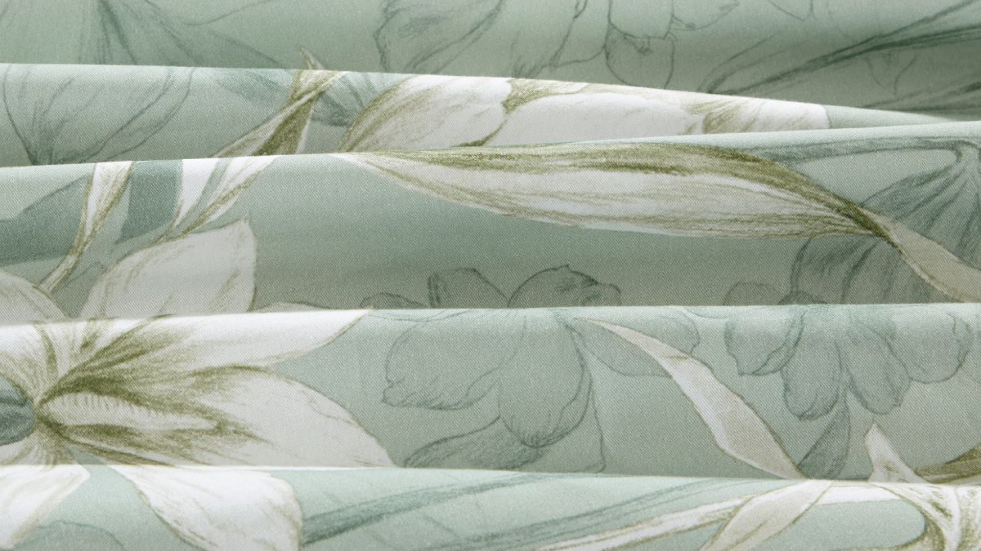 На нефритовом фоне молочные лилейники с шоколадными веснушками, гордые аммарилисы и трогательные зонтики аллиумов облетают бабочки-крапивницы шоколадно-охрового причудливого окраса. Ткань-компаньон оливкового цвета.