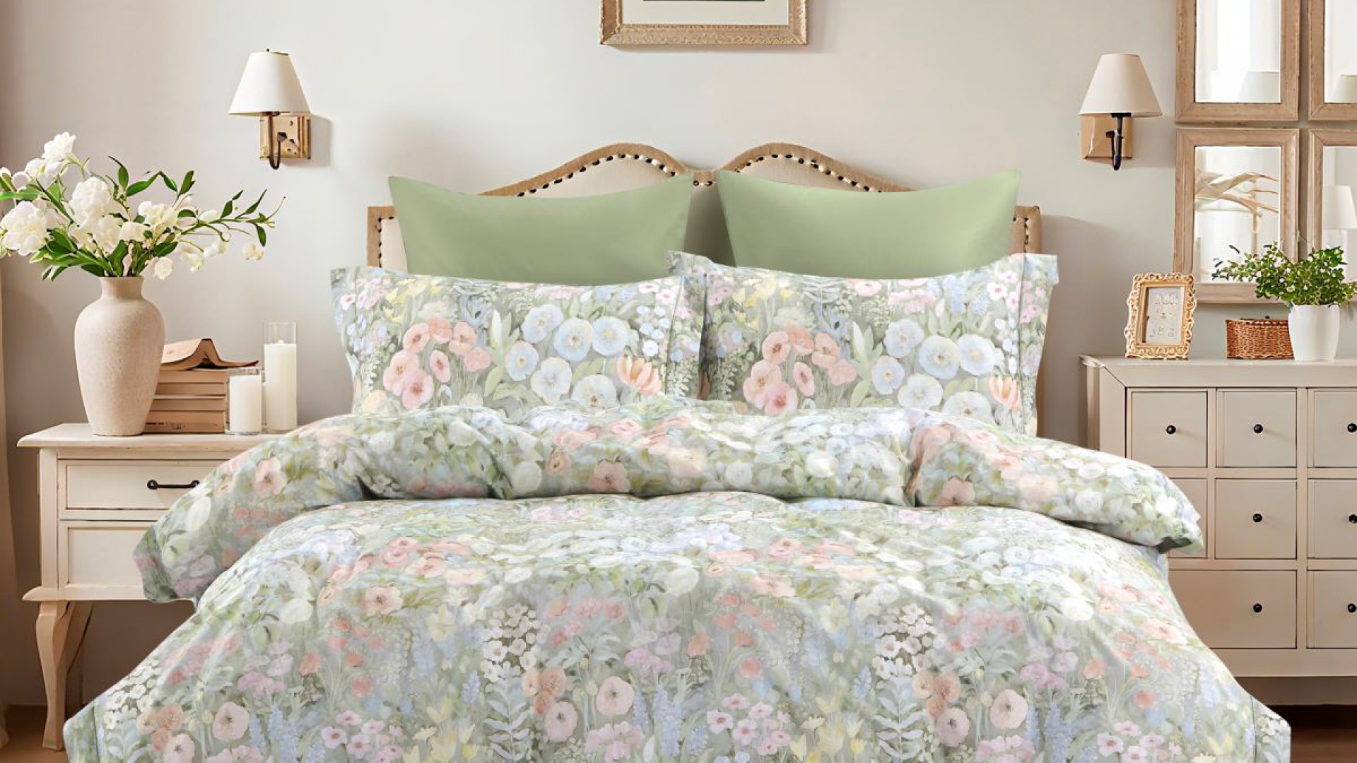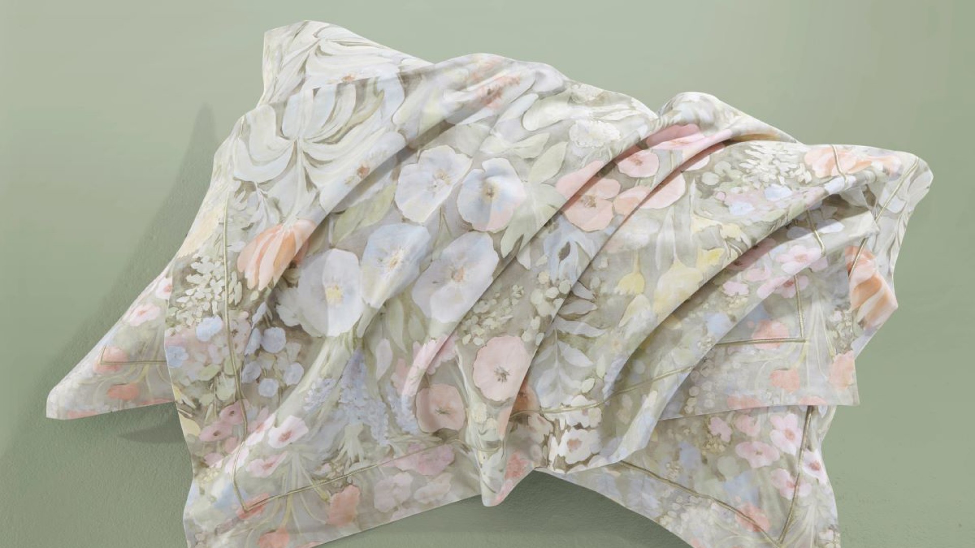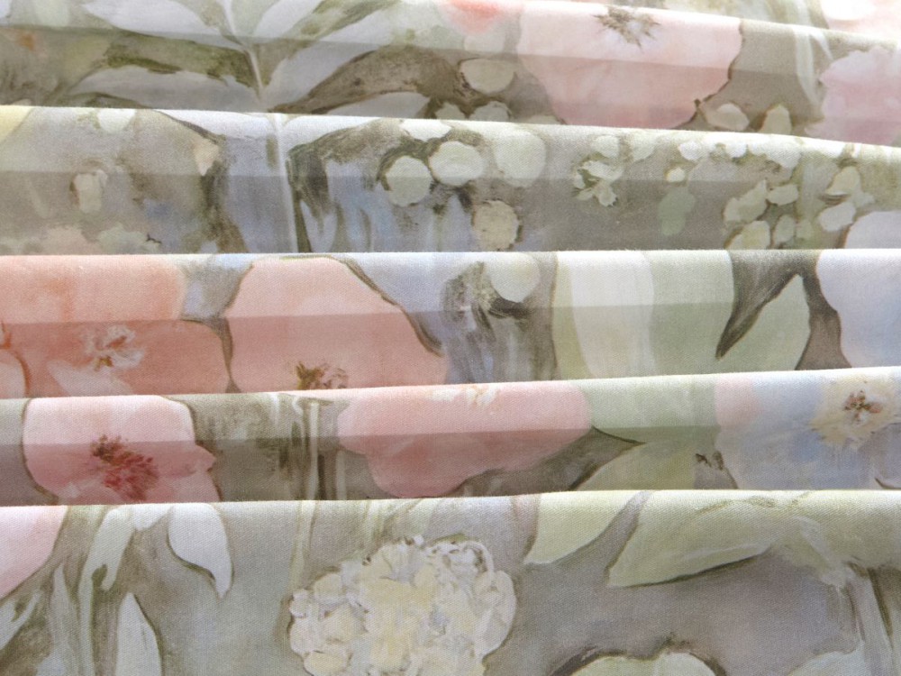 Ковер из полевых цветов в пастельных тонах с акварельными ранункулюсами всех возможных цветов. Оттеняет все это великолепие однотонная ткань-компаньон в цвете Виридан.