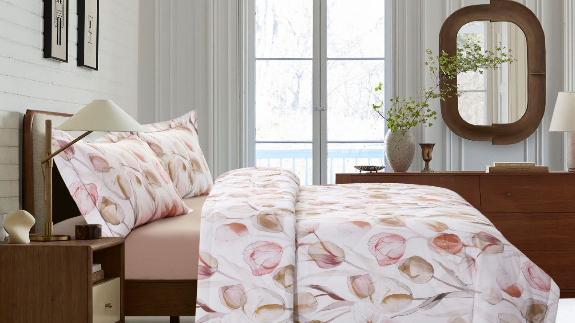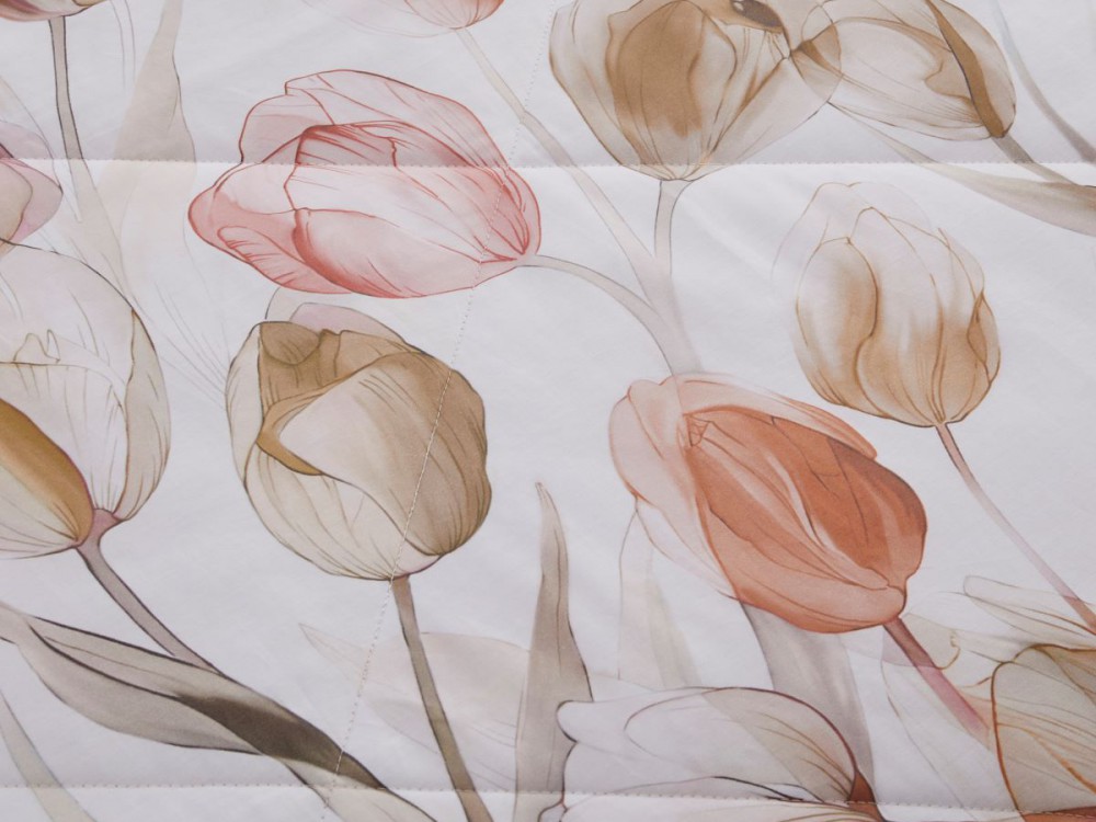 Необычное сочетание: простынь цвета марокканского песка и стилизованные акварельные тюльпаны. Такое белье точно будет акцентом в Вашей спальне или привлечет внимание как подарок.